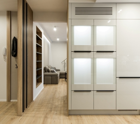Jednym z elementów istotnych dla wyglądu oraz funkcjonalności przedpokoju jest światło. W tym pomieszczeniu uwzględnienie jego źródła jest niezbędne - głównie ze względu na to, że często nie dociera tu odpowiednia dawka promieni słonecznych. Dobrze dobrane pozwoli nam podkreślić wybrane elementy wystroju oraz stworzyć komfortową przestrzeń. Do dyspozycji mamy zarówno dyskretne lampki LED, kinkiety w nowoczesnych i stylowych oprawach, jak i ruchome punkty, pozwalające na regulację oświetlenia w zależności od potrzeb czy nastroju. Jedną z ciekawszych propozycji jest także podświetlenie szklanych frontów szaf. Całość prezentuje się nowocześnie i oryginalnie - wyjaśnia architekt KODO.