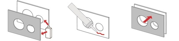 Montaż przycisku TECEloop warto rozpocząć od przygotowania materiału, którym chcemy wypełnić przycisk, dopasowując go do wymiarów płytki montażowej (216 x 145 mm) i do grubości ok. 4 mm. Z kolei łączna grubość płytki własnej, kleju i płytki montażowej (6 mm) powinna wynosić 11 mm. Kolejny krok to nałożenie odpowiedniego kleju na powierzchnię płytki montażowej. Klej do łączenia powierzchni – według wskazań dostawcy materiału wykończeniowego – musi połączyć go trwale z tworzywem płytki montażowej (ABS). Ostatni etap polega na dokładnym dociśnięciu obu powierzchni do siebie.