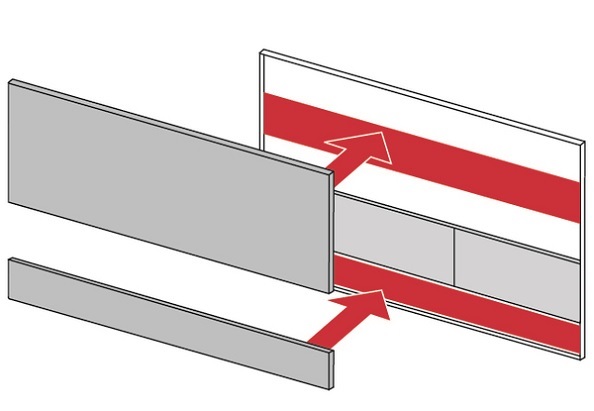 W przypadku modelu TECEsquare należy dociąć materiał własny grubości 5 mm w prostokąty o wymiarach: 220 (±0,2) x 30,5 mm (±0,2) oraz 220 (±0,2) x 69,5 (±0,2). W następnym kroku materiał doklejany jest do płytki bazowej za pomocą fabrycznych taśm samoprzylepnych. W przypadku użycia materiałów porowatych warto zadbać o przyczepność taśmy w sposób zgodny z zaleceniami producenta okładziny.