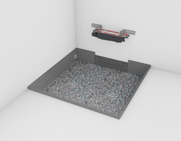 Przed montażem maty wygłuszającej i rozłożeniem taśmy brzegowej posadzkę należy odkurzyć i wyczyścić. W systemie marki TECE odcinek taśmy dylatacyjnej profilowanej pod syfon, wymaganej do montażu przyściennego, znajduje się w zestawie z kolanem odpływowym. Następnym krokiem jest instalacja syfonu, do której możemy wykorzystać mocowanie ścienne lub stopki montażowe. Po wypoziomowaniu podłączamy odpływ do kanalizacji - z uwzględnieniem minimalnego spadku 1%, a następnie sprawdzamy szczelność połączeń. Kolejny etap to wylewka jastrychowa. Zwróćmy uwagę na dokładne wypełnienie przestrzeni wokół syfonu.