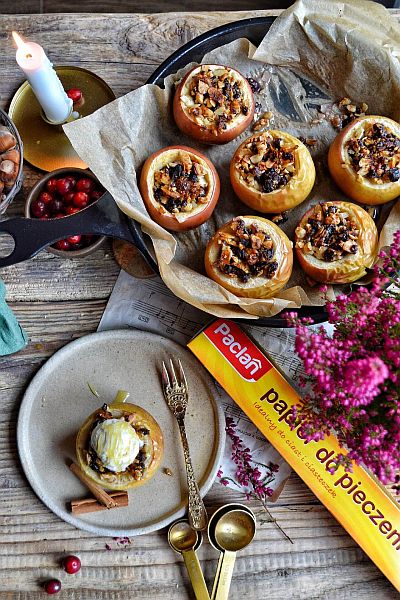 Jabłka najlepsze są na ciepło z gałką lodów waniliowych – kontrast temperatur i tekstur podbija smak i daje efekt deseru restauracyjnego. Do tego kleks gęstego jogurtu naturalnego, miód, cynamon – miksujmy dodatki zgodnie z własnymi preferencjami. Chcąc przygotować wersję bardziej dziecięcą, możemy zrezygnować z cynamonu i dodać do środka krówki lub posiekaną czekoladę.